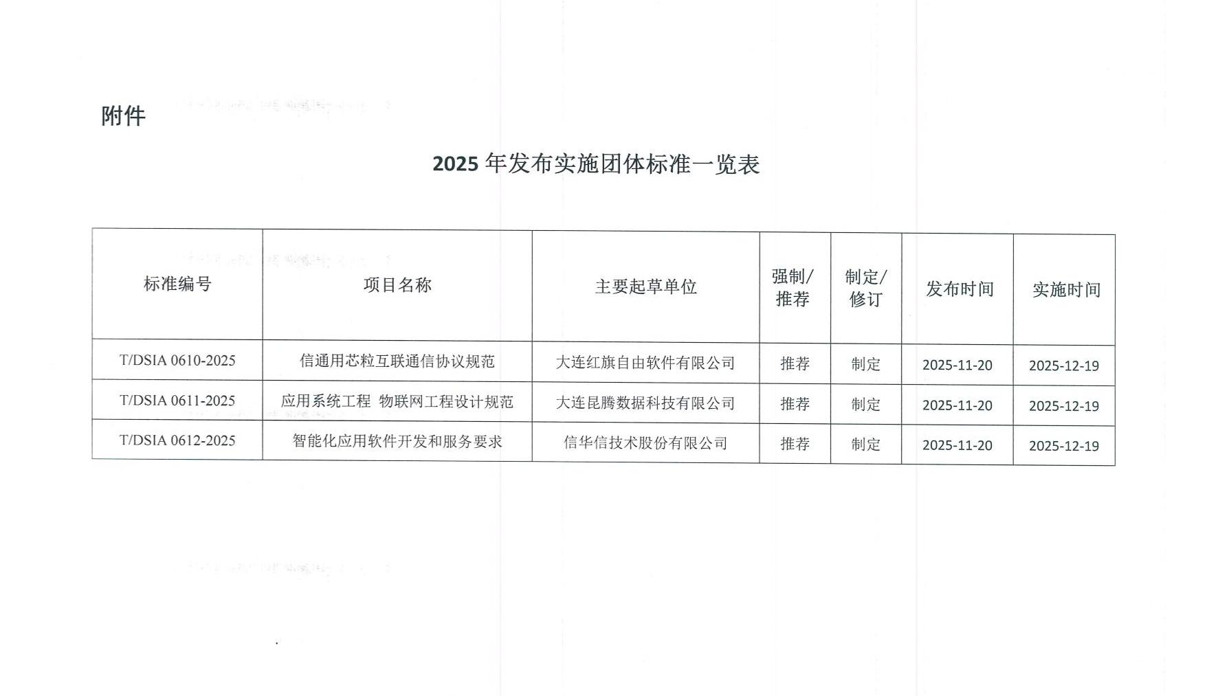 为推进我市软件和信息技术服务行业管理的规范化、标准化,促进行业自律与国际接轨,保障产业的健康有序和可持续发展,根据大连软件行业协会《关于下达2024年团体标准制定项目计划的通知》,大连软件行业协会组织相关标准起草单位,制定《信通用芯粒互联通信协议规范》、《应用系统工程 物联网工程设计规范》、《智能化应用软件开发和服务要求》三项团体标准,现正式发布实施。